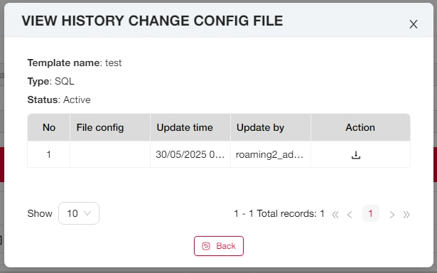 - Sau đó bấm View detail/ update -> chọn view log xem lịch sử thay đổi của file -> hiển thị lịch sử thay đổi file với file_config ko có giá trị, API trả về null