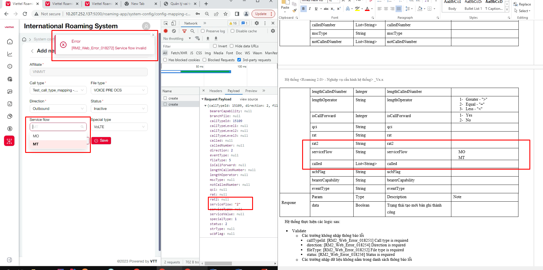 -> KQTT: thông báo lỗi Service flow invalid (FE truyền sai giá trị với giải pháp)