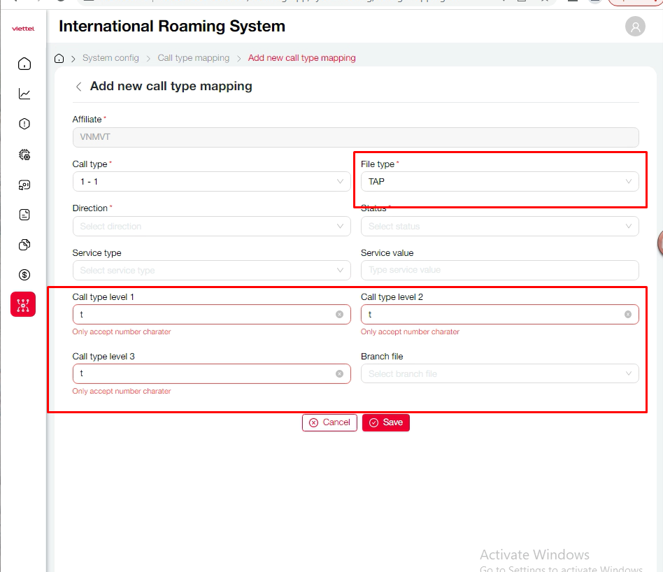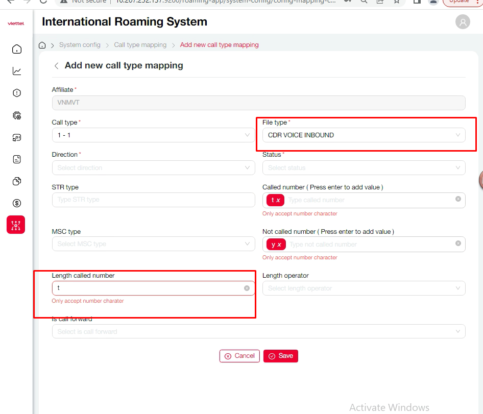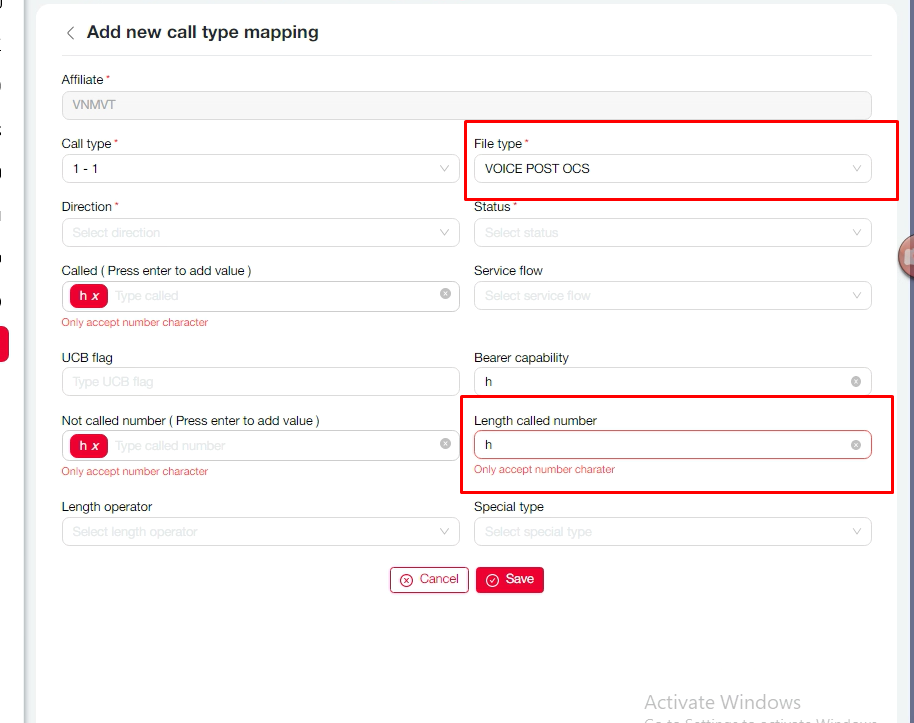 Các trường Call type level 1, Call type level 2, Call type level 3, Called number, Not called number, Length called number, Called: nhập kí tự chữ