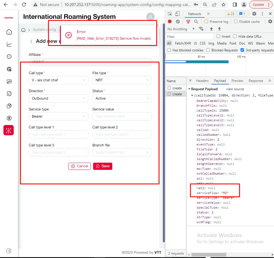 -> KQTT: Thêm mới không thành công báo lỗi như hình -> vì FE truyền thừa trường serviceFlow