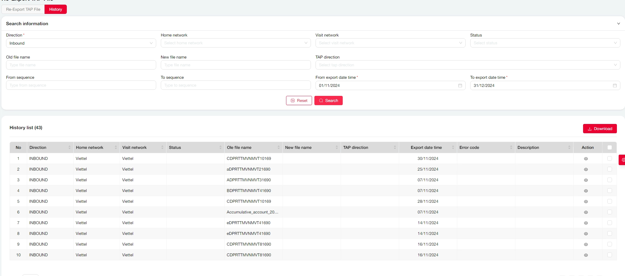 [Re-export tap file] Lỗi khi re export thành công, tại tab history không hiển thị trạng thái