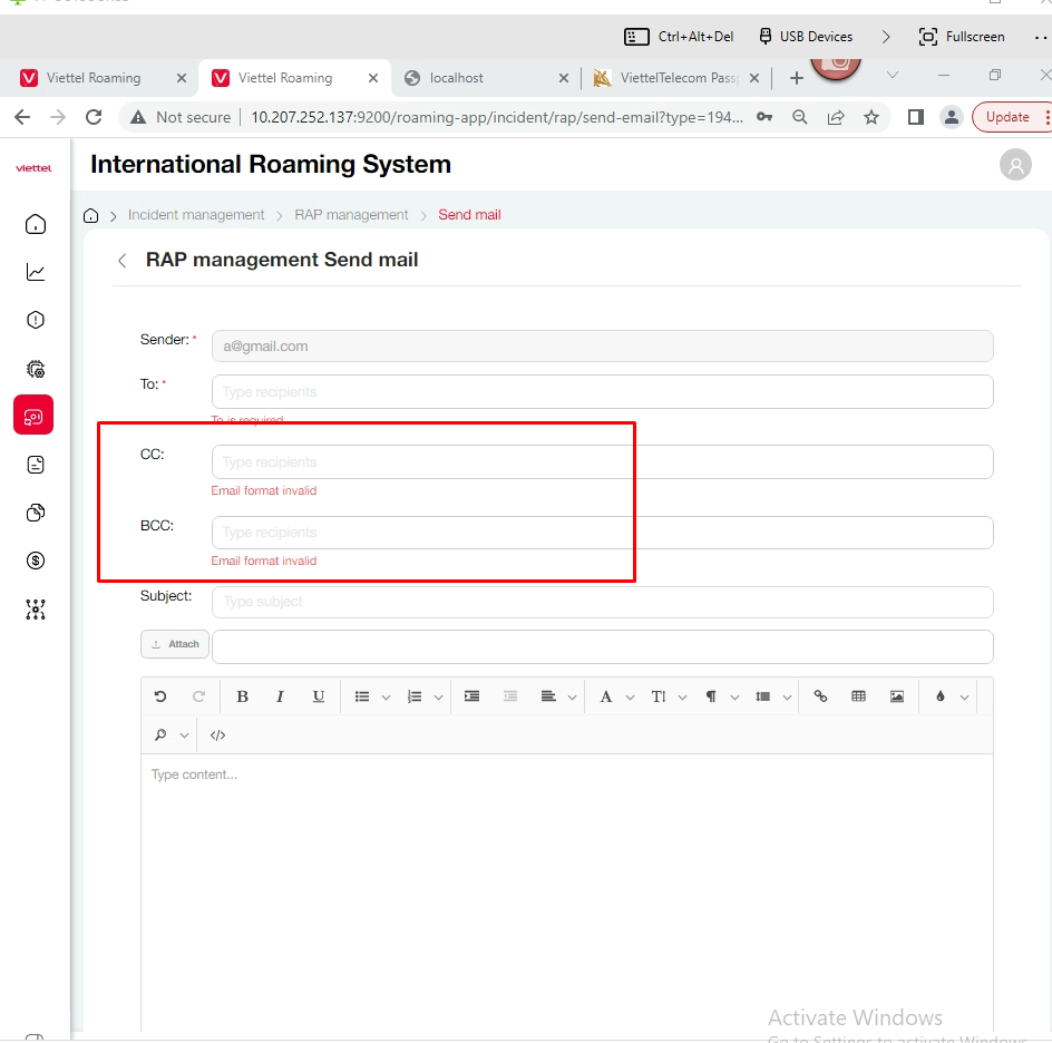Nhập các trường cc, bcc không đúng định dạng hợp lệ, clear giá trị các trường đó