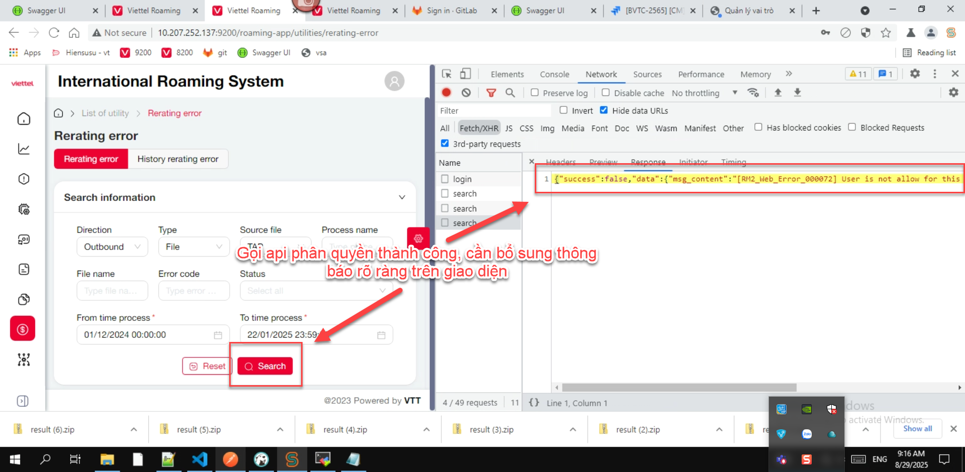 Step 3: vào màn rerating error, tab rerating error, nhập các thông tin của file và nhấn search, nhấn f12 để check xem có gọi api thành công không