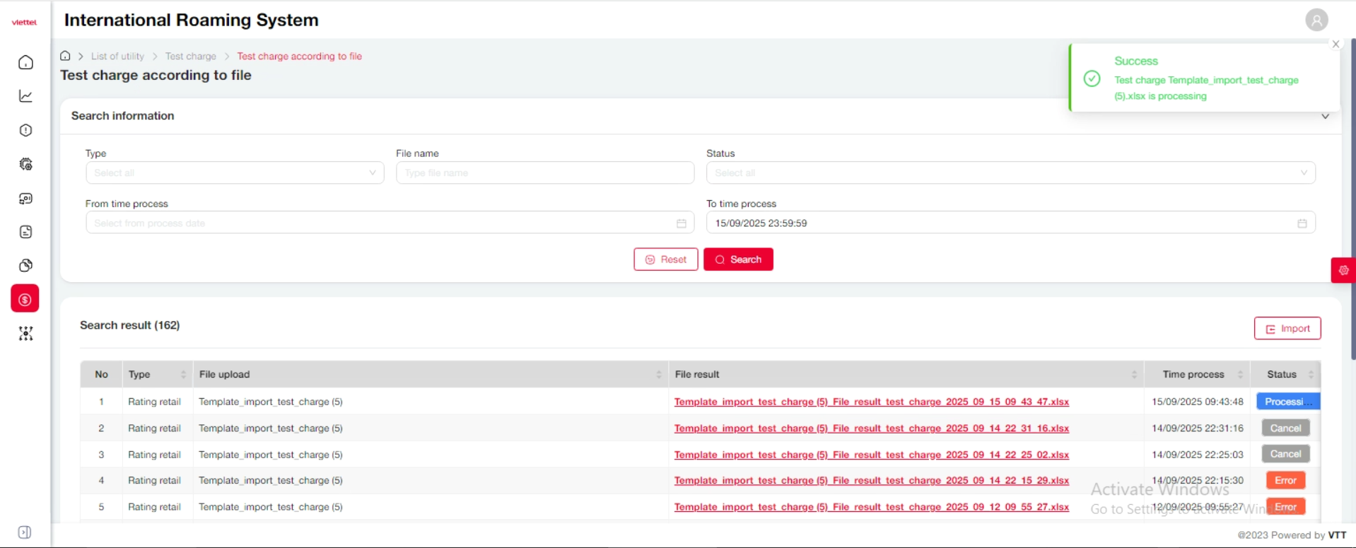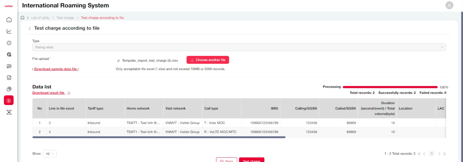 - tại màn test charge theo file tải lên 1 file có 2 bản ghi.
