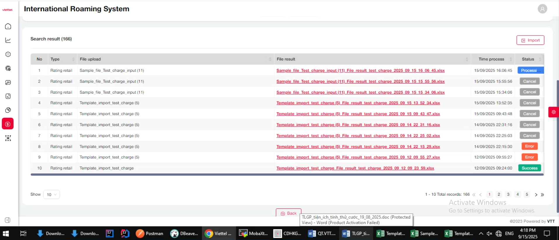Sau khi tải file, validate hợp lệ và click test charge. Hệ thống hiển thị status = processing nhưng sau 10 phút không tự động cập nhật trạng thái, cần reload trang để cập nhật status.
