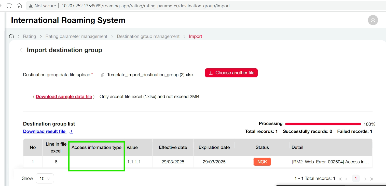 [Thông luồng][Destination group] trường Access information type lỗi không import được