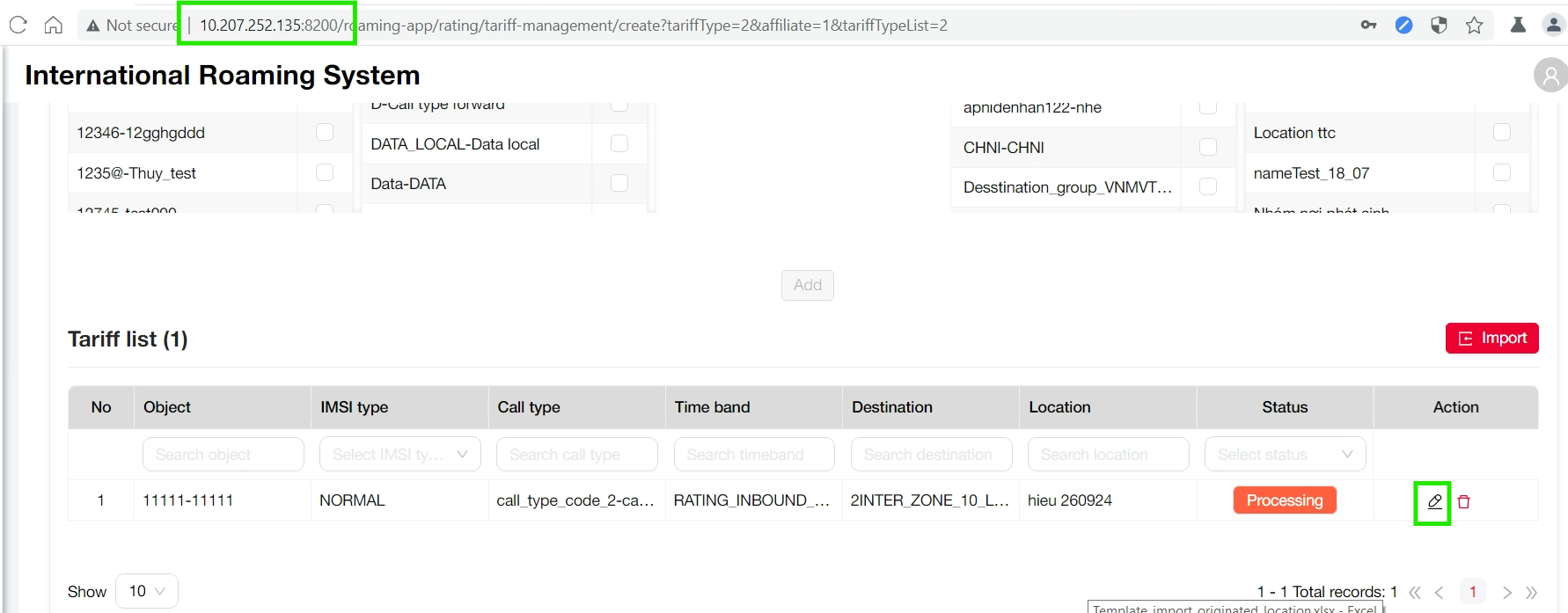 - tại màn Add new tariff, tab Tariff list, chọn 1 bản ghi trạng thái Processing nhấn icon Updated