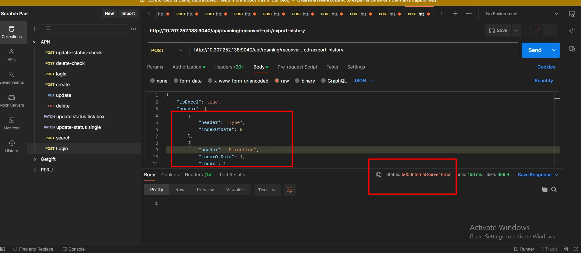 o Nếu không truyền header báo lỗi: [RM2_Web_Error_000026] Export header is required